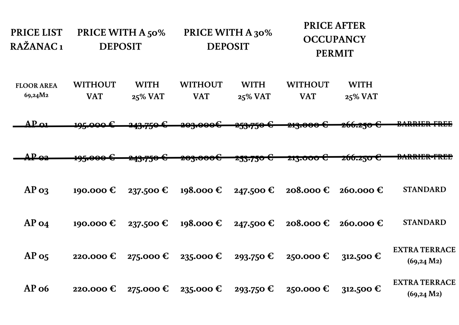 The apartment is delivered with complete documentation and all required permits. It is handed over with entrance and interior doors, ceramic flooring, a fully completed bathroom with toilet including sanitary fittings, complete electrical installation (sockets and switches), and air conditioning. Of course, the apartment will also be fully painted upon handover.