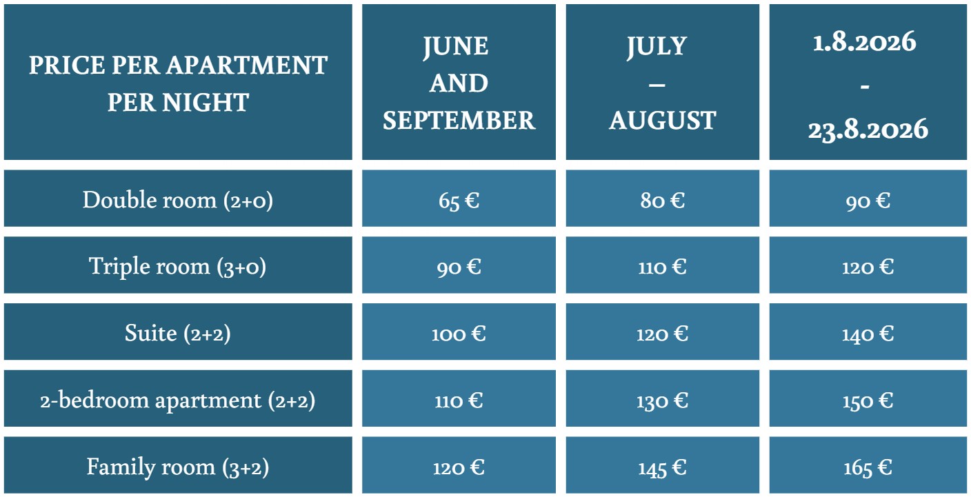 The listed prices (EUR) are for accommodation with breakfast per apartment per night, regardless of the number of guests. A sea view may be subject to an additional surcharge during peak season.