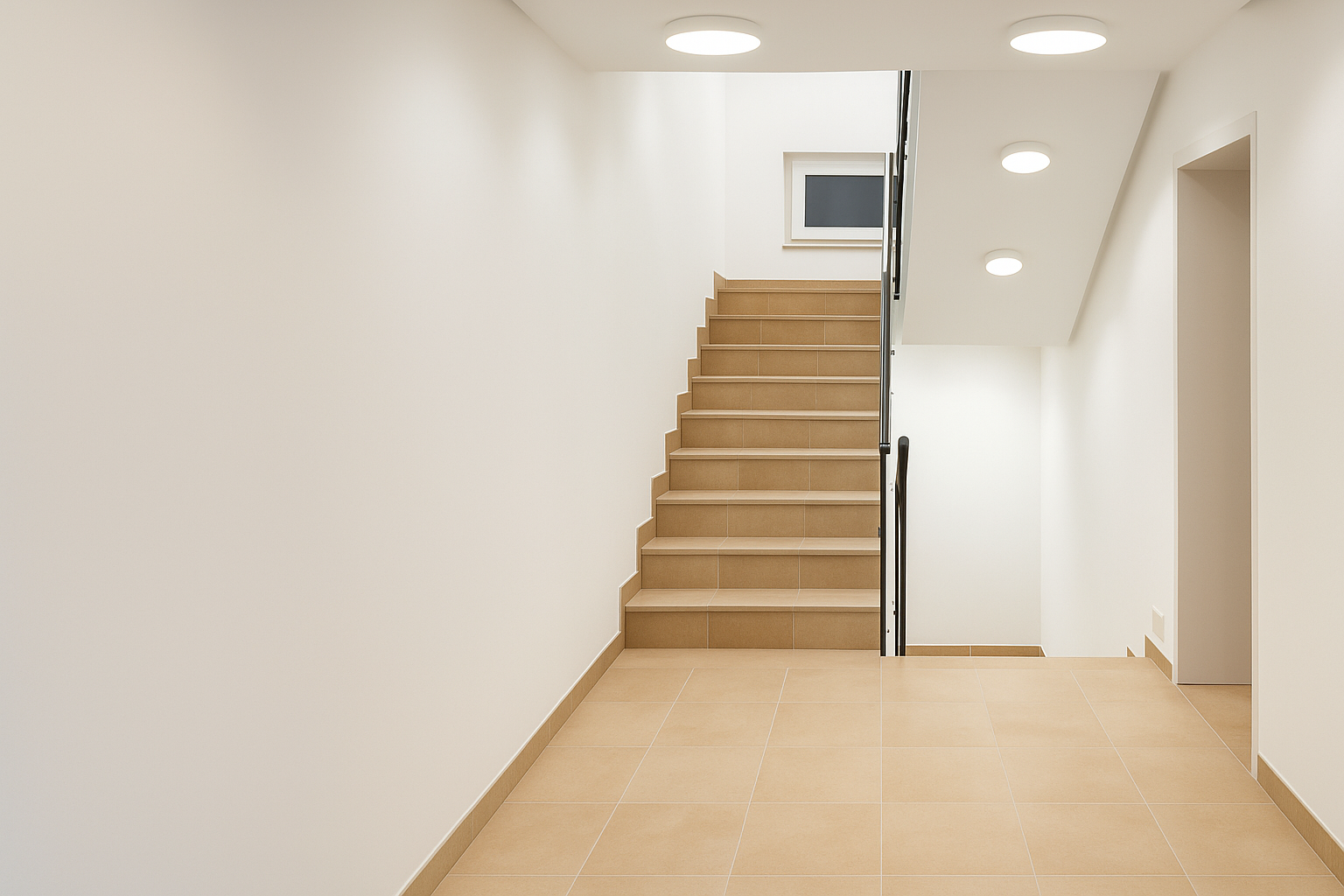 V spoločných priestoroch (chodby a schodište) bude keramická dlažba so soklom, steny budú ostierkované a namaľované hygienickým náterom. Na schodišti bude zábradlie. Elektrické inštalácie so svietidlami v spoločných priestoroch so sú zahrnuté v cene apartmánov.