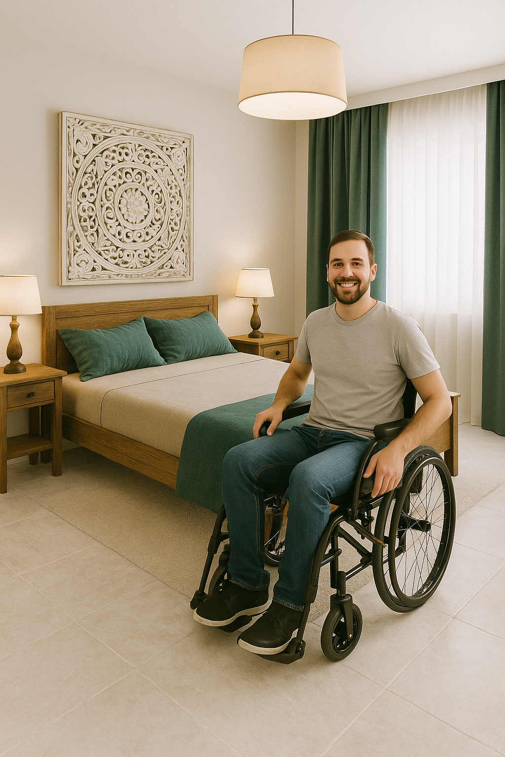 Dvojspálňové apartmány prispôsobené osobám s obmedzenou pohyblivosťou, bez schodov a so širokými dverami. Apartmány majú terasu a pohľad na more (70 m²).