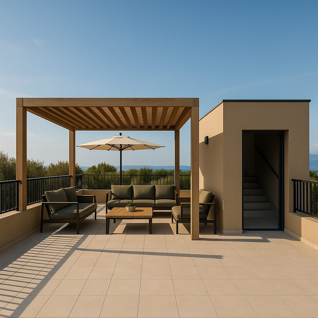 Dvojspálňové apartmány s bakónom a dodatočnou veľkou terasou na streche budovy a pohľadom na more (70 m² + 70 m²).