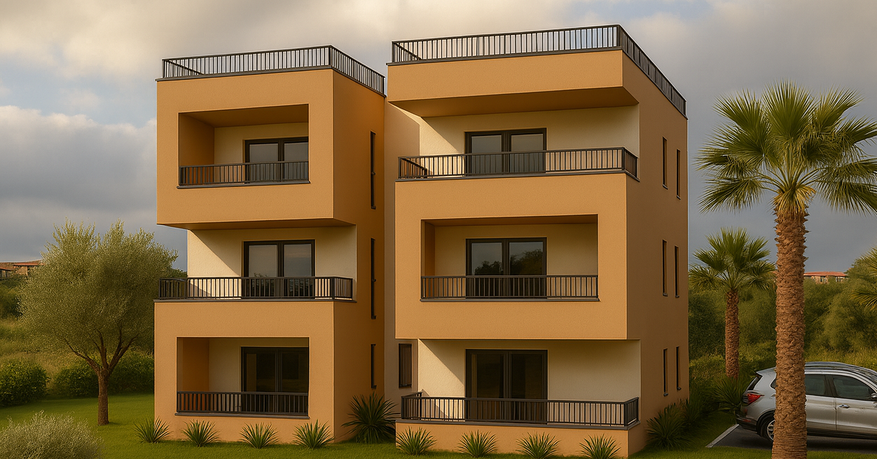 Dvosobni apartmani sa balkonom i dodatnom velikom terasom na krovu zgrade, sa pogledom na more (70 m² + 70 m²).