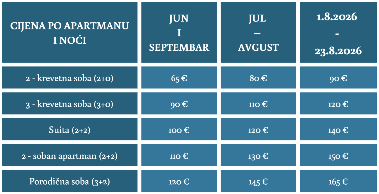 Navedene cijene (EUR) odnose se na smještaj sa doručkom po apartmanu za jednu noć, bez obzira na broj smještenih osoba. Pogled na more može se u špicu sezone dodatno naplaćivati.